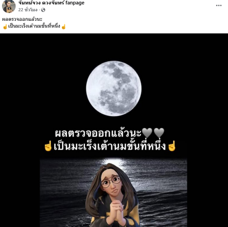ล่าสุด จันทร์จวง ได้เปิดเผยผลตรวจร่างกายว่า ผลตรวจออกแล้วนะ เป็นมะเร็งเต้านมขั้นที่หนึ่ง โดยมีแฟนๆต่างเข้ามาคอมเมนต์ส่งกำลังใจกันอย่างล้นหลาม