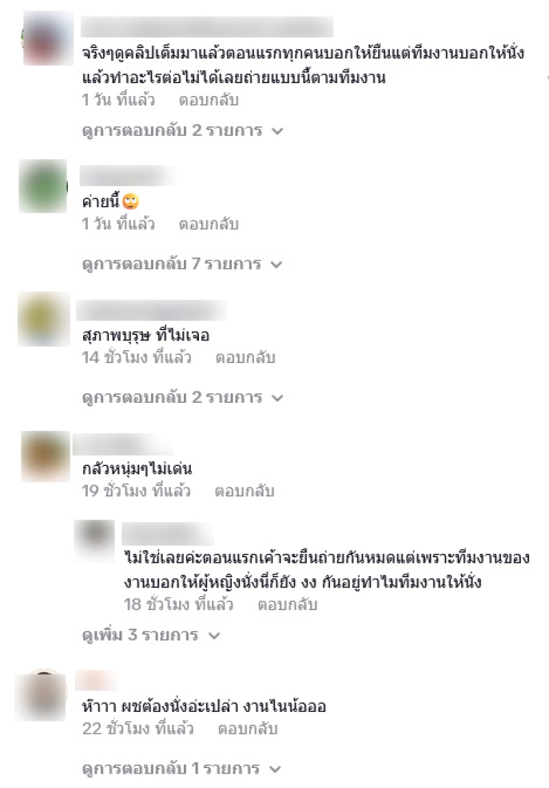 โดยมีชาวเน็ตเข้ามาคอมเมนต์มากมาย อาทิ สุภาพบุรุษ ที่ไม่เจอ,กลัวหนุ่มๆไม่เด่น,จริงๆดูคลิปเต็มมาแล้วตอนแรกทุกคนบอกให้ยืนแต่ทีมงานบอกให้นั่งแล้วทำอะไรต่อไม่ได้เลยถ่ายแบบนี้ตามทีมงาน,ห๊าาา ผชต้องนั่งอ่ะเปล่า งานไหนน้อ,ตอนเห็นครั้งแรกยังเอ้ะเลย ใครจัดท่า,หาเก้าอี้ให้สาวๆนั่งจะดูดีกว่า