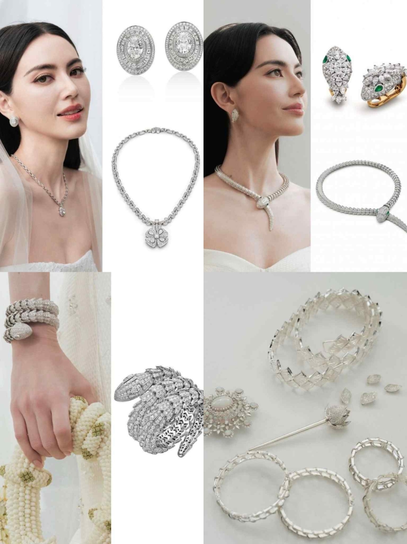ในพิธีหลัก ใหม่ เลือกเครื่องประดับจากแบรนด์จิวเวลรีระดับโลก Bvlgari คอมพลีตลุค ด้วยคอลเลกชัน Serpenti สุดไอคอนิก ทั้งสร้อยคอ กำไลงู และต่างหูทองคำขาวประดับเพชรเต็มๆ ที่สื่อถึงพลัง ความสง่างาม และ การปกป้อง