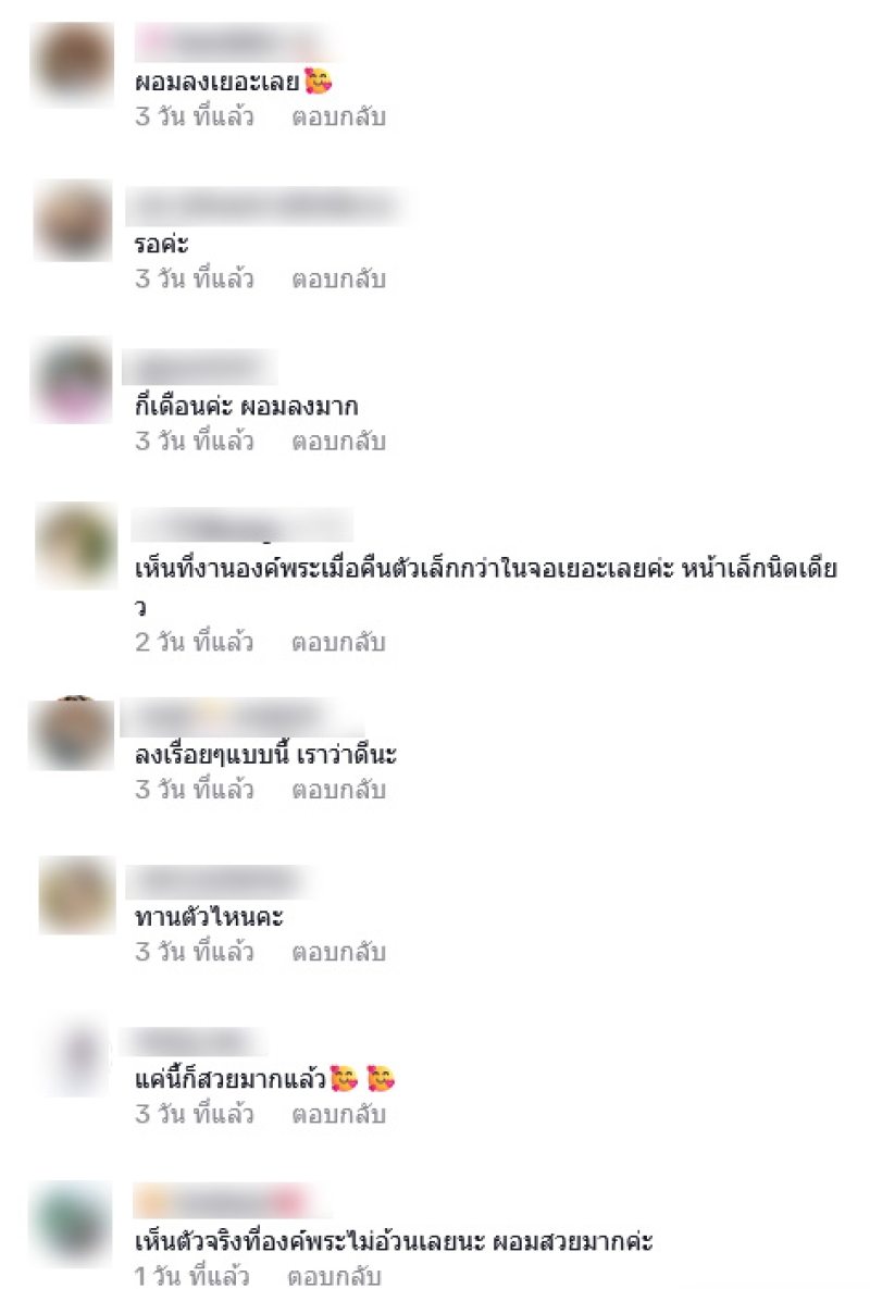 ท่ามกลางแฟนๆต่างเข้ามาคอมเมนต์อย่างมาก อาทิ แขนลดลงเยอะเลย,รอค่าา อยากเทสมากค่ะ พุงหนามาก คลอดลูกมาเป็น10ปียังไม่ลง กินอะไรก็ไม่ลงเลย,เจอตัวจริง ผอมมาก,เจอที่งานองค์พระน้องตัวนิดเดียวเองค่ะ,หู้ยร่างทองกลับมาแล้วค่ะ,หู้ยลดลงเยอะเลยค่ะ