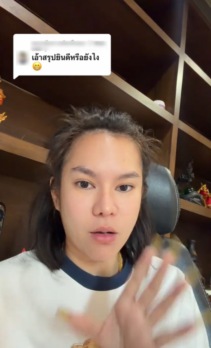 ไม่เคยคุยกับฟิล์มเลย คุยผ่านมายด์ตลอด หนูให้เกียรติน้อง ยืนยันยินดีกับทั้งคู่ ไม่คิดอยากจะได้ฟิล์มคืน แต่หนูสงสารสมายด์ ที่ไปจุ่มได้ตัวซีเคร็ต โอเคเนาะ พร้อมทั้งตอบคนที่มาถามเรื่องที่ยังให้เงินอดีตสามีเดือนละแสนด้วยว่า เดือนละแสนให้อยู่ไหมคะ แบบนี้ แม่น้ำหนึ่ง ตอบชัดว่า ไม่ให้จ้า