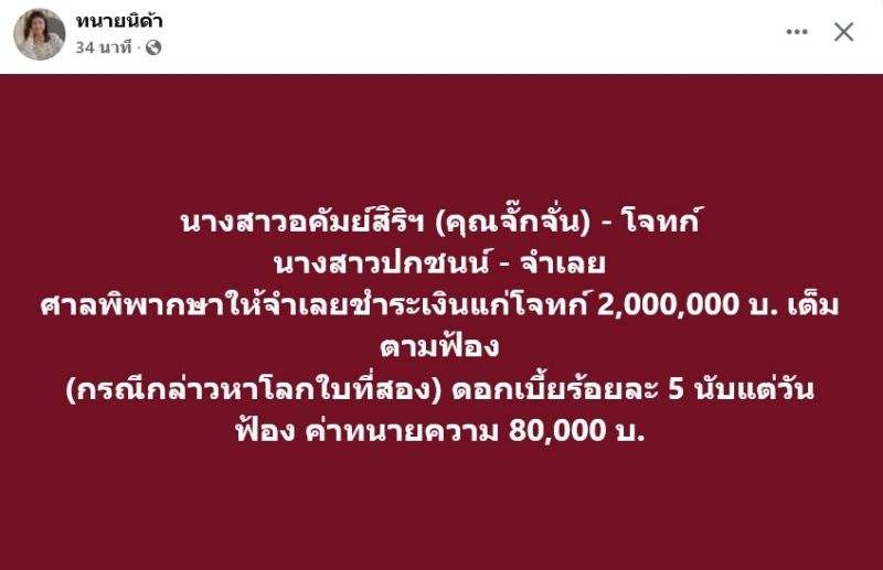 เรียกได้ว่า ในที่สุดก้ได้รับความเป็นธรรม เมื่อทาง ทนายนิด้า ได้ออกมาโพสต์ว่า นางสาวอคัมย์สิริฯ (คุณจั๊กจั่น) - โจทก์ นางสาวปกชนน์ - จำเลย ศาลพิพากษาให้จำเลยชำระเงินแก่โจทก์ 2,000,000 บ. เต็มตามฟ้อง (กรณีกล่าวหาโลกใบที่สอง) ดอกเบี้ยร้อยละ 5 นับแต่วันฟ้อง ค่าทนายความ 80,000 บ.