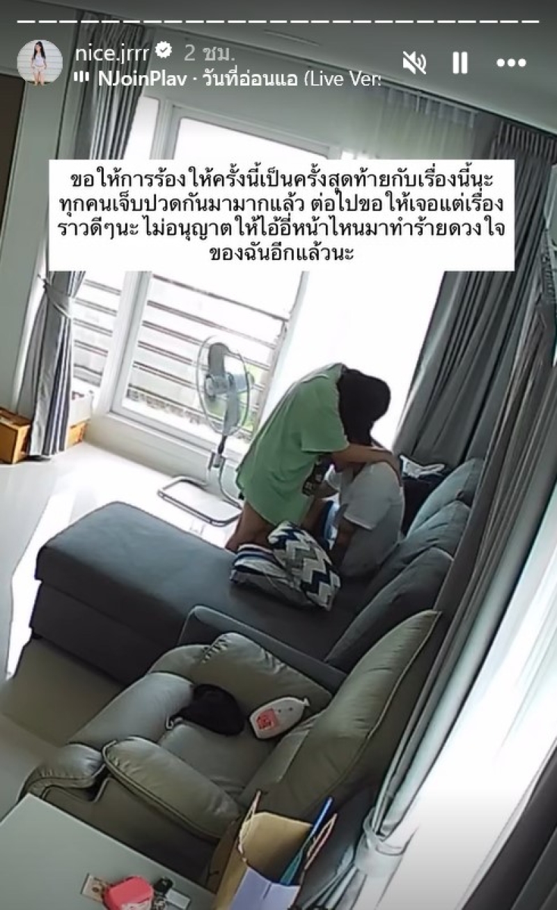 และสตอรี่ต่อมา ได้เดินไปสวมกอดสามี และได้โพสต์ว่า ขอให้การร้องให้ครั้งนี้เป็นครั้งสุดท้ายกับเรื่องนี้นะ ทุกคนเจ็บปวดกันมามากแล้ว ต่อไปขอให้เจอแต่เรื่อง ราวดีๆนะไม่อนุญาตให้ไอ้อีหน้าไหนมาทําร้ายดวงใจ ของฉันอีกแล้วนะ