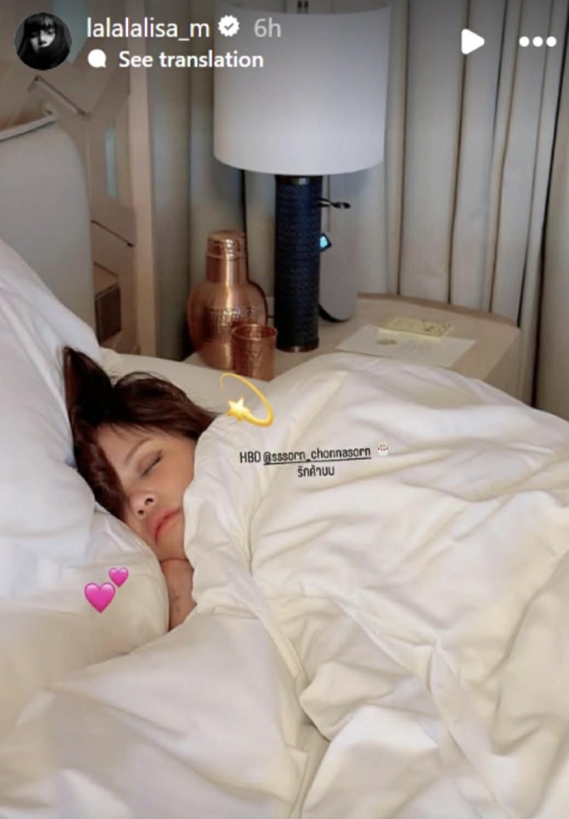 ในโพสต์นั้น ลิซ่า เลือกแชร์ภาพของเพื่อนสนิทชาวไทยอย่าง สร ขณะพักผ่อนอยู่ในห้องที่อบอุ่น คล้ายกับห้องพักโรงแรม ทำให้บรรยากาศดูสบาย และ เป็นกันเอง