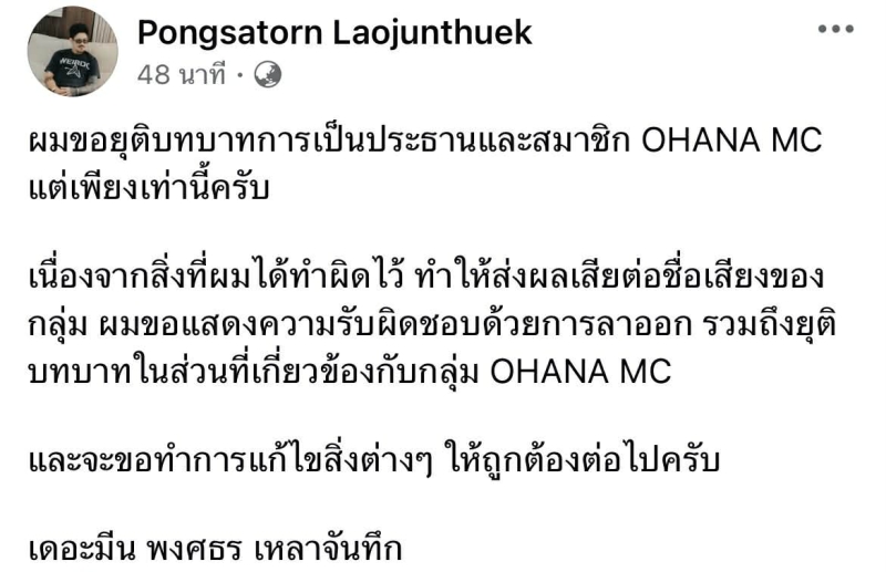 เรียกได้ว่า การประกาศล่าสุดของ เดอะมีน พงศธร เหลาจันทึก ทำเอาแฟนๆ ตกใจไม่น้อย หลังเจ้าตัว ตัดสินใจลาออกจากตำแหน่งประธาน และ สมาชิกของ OHANA MC เพื่อรับผิดชอบต่อความผิดพลาดที่เกิดขึ้น และ ผลกระทบต่อชื่อเสียงของกลุ่ม