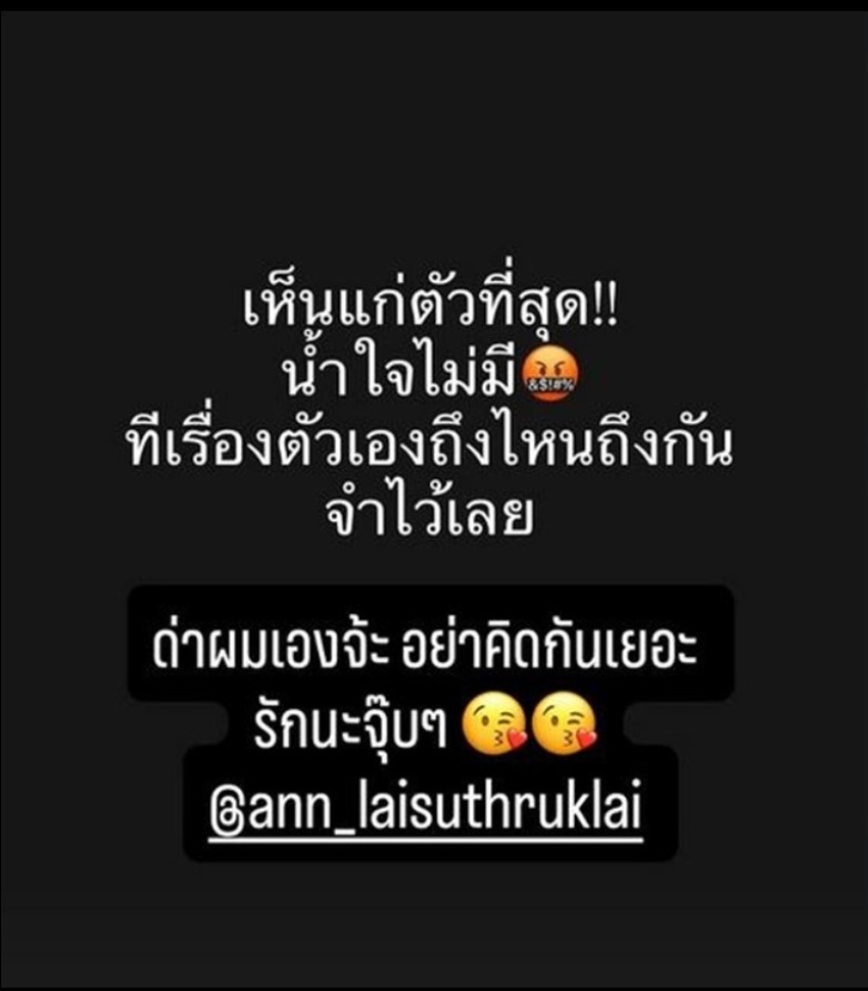 จากกรณีที่ก่อนหน้านั้น ืลทางดาราสาว อย่าง แอน อลิชา ได้โพสต์ สตอรี่ไอจีฟาดใครกันนะ โดยได้เผยว่า เห็นแก่ตัวที่สุด น้ำใจไม่มี ทีเรืองตัวเองถึงไหนถึงกัน จำไว้เลย บอกเลยว่าทำเอาชาวเน็ตต่างสงสัยว่าเกิดอะไรขึ้น ฟาดใครกันนะ? และพากันโยงไปต่างๆนาๆนั้นเอง