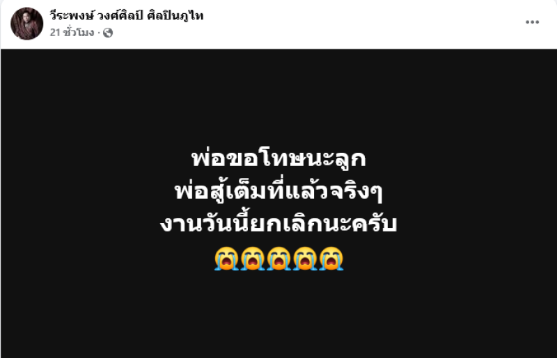 กลายเป็นประเด็นดราม่าร้อนแรงสำหรับ พ่อวีระพงษ์ วงศ์ศิลป์ หัวหน้าคณะ ศิลปินภูไท ที่ไลฟ์สดพร้อมลูกทีม หลังถูกเจ้าหน้าที่สั่ง ไม่อนุญาตให้แสดง แบบกะทันหัน ทั้งที่ทีมงานเดินทางจากต่างจังหวัดมาตั้งเวทีและระบบทั้งหมดเสร็จเรียบร้อยแล้ว
