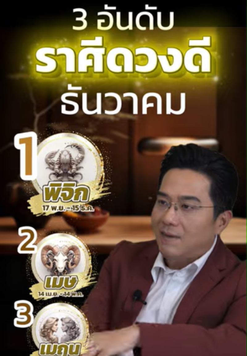 ล่าสุดนักพยากรณ์ดังอย่าง หมอช้าง ทศพร ศรีตุลา ได้ทำนายดวง จัดอันดับ 3 ราศี ดวงดีในเดือนธันวาคม 2568 การเงินแข็งแรงดี โชคลาภมีเข้ามาให้ลุ้น