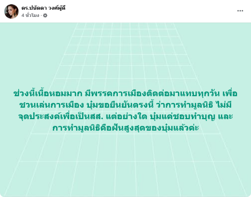 ช่วงนี้เนื้อหอมมาก มีพรรคการเมืองติดต่อมาแทบทุกวัน เพื่อชวนเล่นการเมือง บุ๋มขอยืนยันตรงนี้ ว่าการทำมูลนิธิ ไม่มีจุดประสงค์เพื่อเป็นสส. แต่อย่างใด บุ๋มแค่ชอบทำบุญ และการทำมูลนิธิคือฝันสูงสุดของบุ๋มแล้วค่ะ