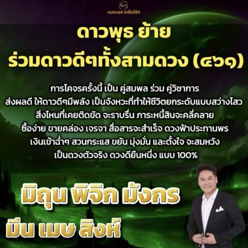 เรียกได้ว่า สายมูเตลูเตรียมรับข่าวดี เมื่อ หมอบอย เคลียร์ชัด นักโหราศาสตร์ชื่อดัง ออกมาพยากรณ์การย้ายใหญ่ของดาวพุธ ซึ่งโคจรร่วมกับดาวดีสามดวง ส่งผลให้หลายราศีได้รับพลังเสริมเต็มพิกัด ช่วยให้ชีวิต และ การงานสว่างไสว