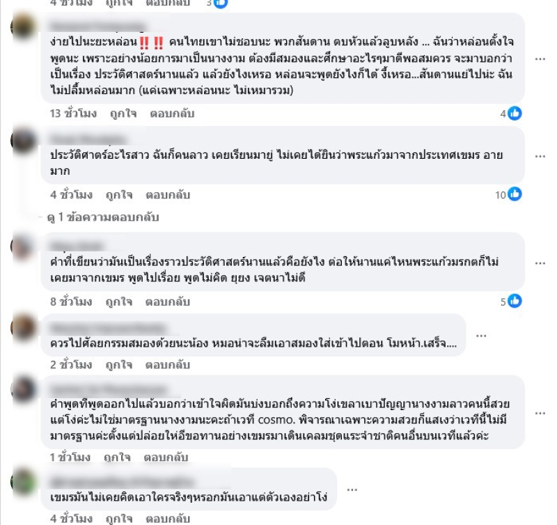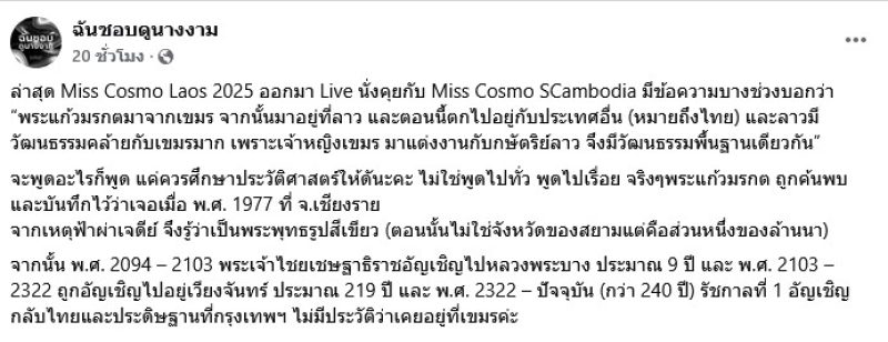 เรียกได้ว่า คนไทยหลายคนเดือดสนั่น เมื่อทางเพจดัง อย่าง ฉันชอบดูนางงาม ได้ออกมาเผยว่า Miss Cosmo Laos 2025 ออกมา Live นั่งคุยกับ Miss Cosmo SCambodia มีข้อความบางช่วงบอกว่า “พระแก้วมรกตมาจากเขมร จากนั้นมาอยู่ที่ลาว และตอนนี้ตกไปอยู่กับประเทศอื่น (หมายถึงไทย) และลาวมีวัฒนธรรมคล้ายกับเขมรมาก เพราะเจ้าหญิงเขมร มาแต่งงานกับกษัตริย์ลาว จึงมีวัฒนธรรมพื้นฐานเดียวกัน”