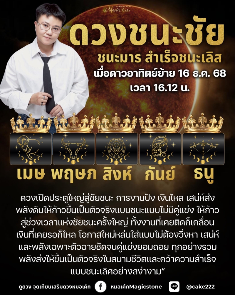 วันที่ 11 ธ.ค. 68 ทาง หมอเค้กดลบันดาล เผย ดาวอาทิตย์ย้าย 16 ธันวาคม 2568 พลังฟ้าเปิดเส้นทาง 5 ราศีคือ เมษ–พฤษภ–เมถุน–สิงห์–กันย์ ให้ก้าวสู่ช่วงเวลาแห่งชัยชนะครั้งใหญ่ ทั้งงานที่เคยติดก็เคลื่อน เงินที่เคยรอก็ไหล โอกาสใหม่หล่นใส่แบบไม่ต้องวิ่งหา เสน่ห์และพลังเฉพาะตัวฉายชัดจนคู่แข่งยอมถอย ทุกอย่างรวมพลังส่งให้ขึ้นเป็นตัวจริงในสนามชีวิตและคว้าความสำเร็จแบบชนะเลิศอย่างสง่างาม