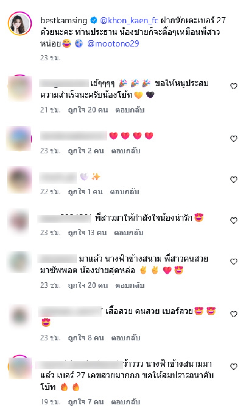พร้อมเขียนแคปชั่นระบุว่า @khon_kaen_fc ฝากนักเตะเบอร์ 27 ด้วยนะคะ ท่านประธาน น้องชายก็จะดื้อๆเหมือนพี่สาวหน่อย @mootono29