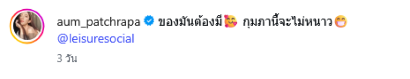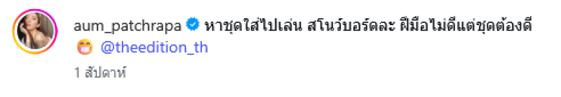 พร้อมเขียนแคปชั่นระบุว่า หาชุดใส่ไปเล่น สโนว์บอร์ดละ ฝีมือไม่ดีแต่ชุดต้องดี และยังโพสต์อีก คลิป ขณะไปลองชุดสวยๆ อีกหลายชุดกันหนาว พร้อมแคปชั่นด้วยว่า ของมันต้องมี กุมภานี้จะไม่หนาว (พร้อมอิโมจิยิ้มกว้างมาก)