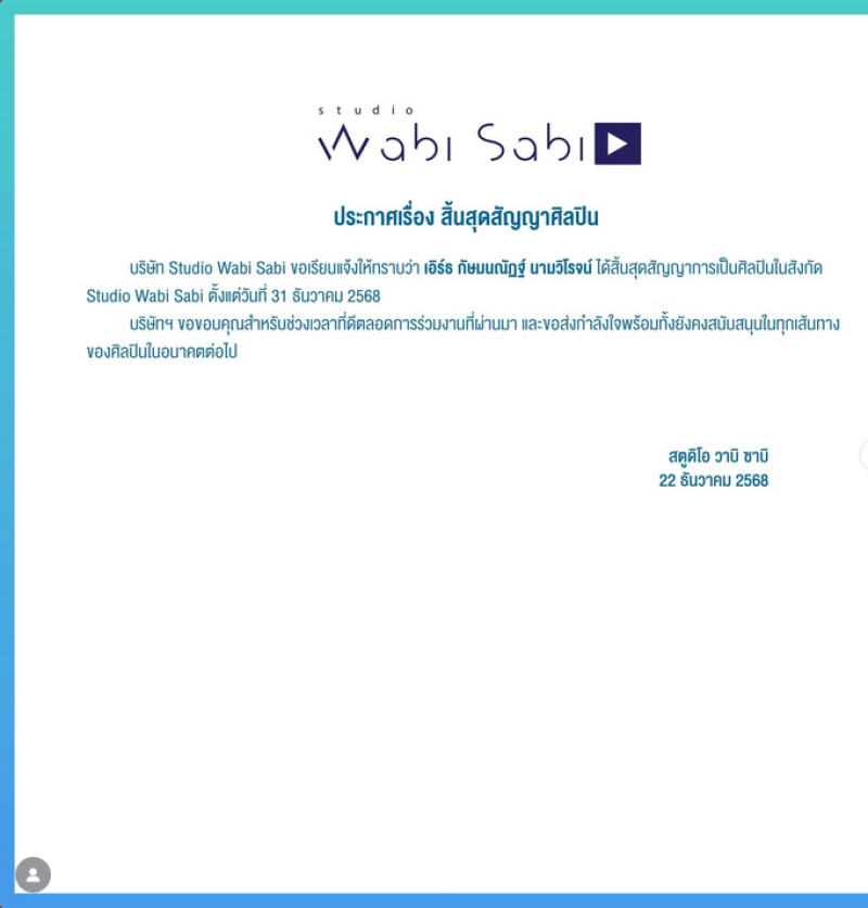 เอิร์ธ กัษมนณัฏฐ์ นามวิโรจน์ ได้สิ้นสุดสัญญาการเป็นศิลปินในสังกัด Studio Wabi Sabi ตั้งแต่วันที่ 31 ธันวาคม 2568 บริษัทฯ ขอขอบคุณสำหรับช่วงเวลาที่ดีตลอดการร่วมงานที่ผ่านมา และขอส่งกำลังใจพร้อมทั้งยังคงสนับสนุนในทุกเส้นทางของศิลปินในอนาคตต่อไป