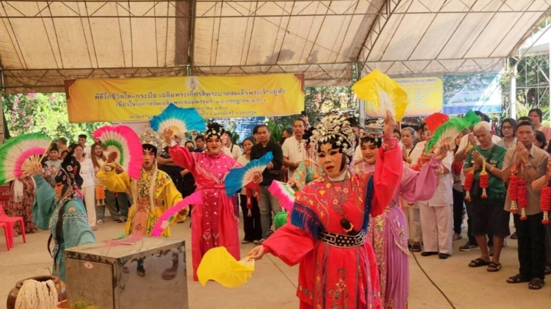 โดยคณะงิ้วได้แต่งกายและร้องเพลงร่ายรำประกอบดนตรี สร้างความตื่นตาตื่นใจให้กับสาธุชนที่เดินทางมาทำบุญเป็นอย่างมาก หลังเสร็จสิ้นได้เดินรอดใต้ท้องม้าออกศึกของเทพเจ้ากวนอู พร้อมกับผูกด้ายแดง เพื่อความเป็นสิริมงคลและความแคล้วคลาดปลอดภัย จากนั้นจุดประทัดเอาฤกษ์เอาชัยได้หมายเลข 2 7 5 และ 0 1