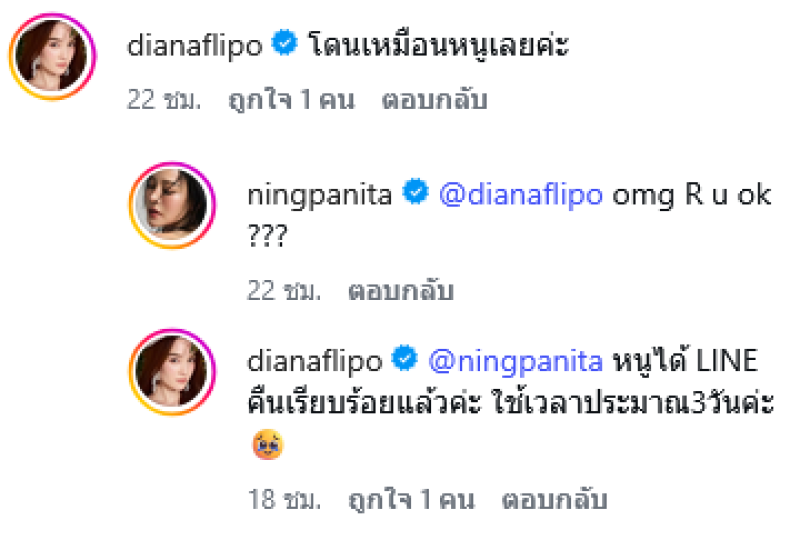 โดยทางด้านนางเอกสาว เดียร์น่า ฟลีโป ก็ได้เข้ามาคอมเมนต์โดนเช่นเดียวกัน หนูได้ LINE คืนเรียบร้อยแล้วค่ะ ใช้เวลาประมาณ3วันค่ะ