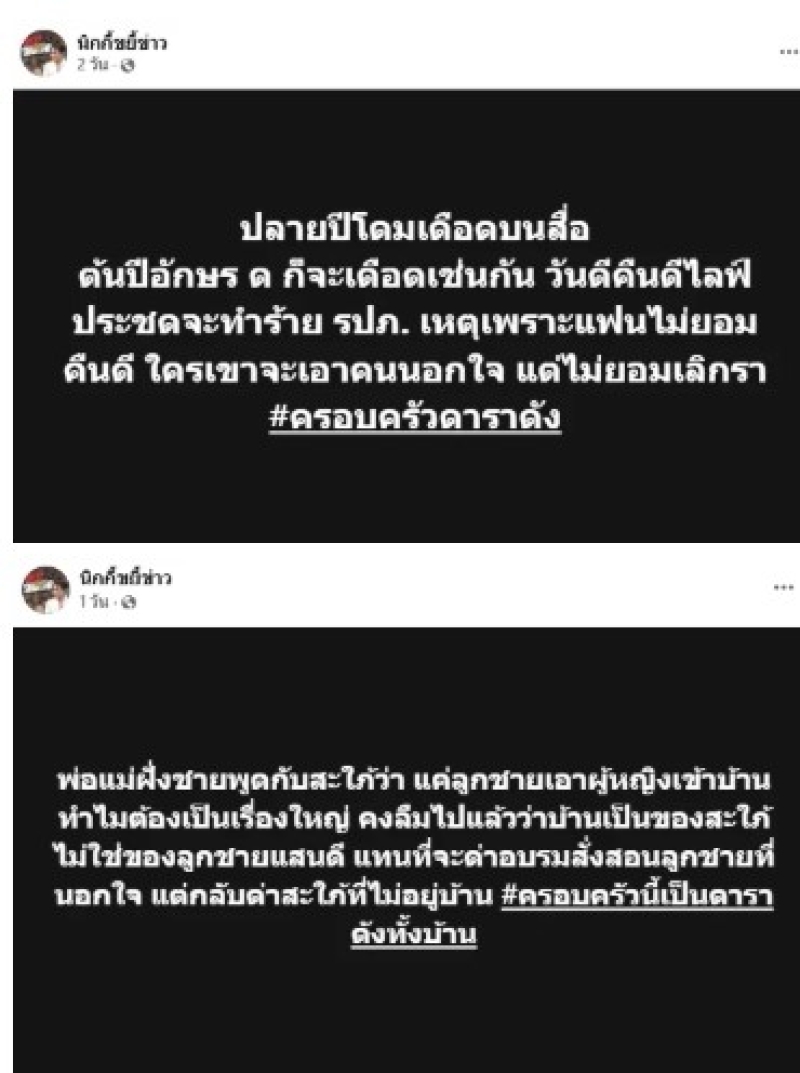 จากกรณีที่ก่อนหน้านั้น ได้มีประเด็นร้อนในวงการบันเทิง เมื่อ เพจดัง นิกกี้ขยี้ข่าว ก็ออกมาโพสต์ข้อความเกี่ยวกับ ดารา ด. นอกใจเมียแต่ก็ไม่ยอมเลิก ส่วนพ่อแม่ฝ่ายชายก็ดันไม่อบรมสั่งสอนลูกแต่ดันไปบอกกับลูกสะใภ้ว่า แค่ลูกชายเอาผู้หญิงเข้าบ้านทำไมต้องเป็นเรื่องใหญ่ ลูกสะใภ้ผิดที่ไม่อยู่บ้าน ทั้ง ๆ ที่่บ้านหลังนั้นเป็นของลูกสะใภ้ ก่อนจะติดแฮชแท็กว่า #ครอบครัวดาราดัง