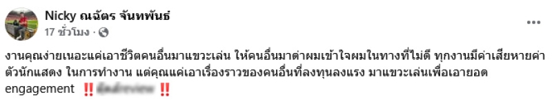ทำเอานักแสดงหนุ่ม นิกกี้ ณฉัตร ออกมาโพสต์โต้เดือดทันทีหลังจากที่เจอเพจดังเขียนวิจารณ์ หลังเจ้าตัวไปร่วมทอล์คกับ หม่ำ จ๊กมก พร้อมเผยสาเหตุเลิกแฟนสาว โดยเจ้าตัวเผยว่า ตอนนี้ยังโสด ยังหาไม่ได้ เพิ่งเลิกกับแฟนไป ยอมรับตอนเลิกมันก็มีเศร้า