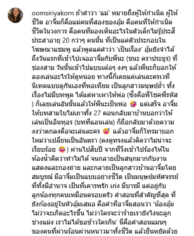 เรียกได้ว่าเป็นอีกหนึ่งโมเมนต์สุดประทับใจเมื่อ อุ้ม สิริยากร ได้บินกลับไทยมาเยี่ยมเยียนบุคคลสำคัญที่สุดในชีวิตอย่าง อาจิ๋ม มยุรฉัตร คุณแม่คนที่ 2 ระบุว่า ถ้าคำว่า แม่ หมายถึงผู้ให้กำเนิด ผู้ให้ชีวิต อาจิ๋มก็คือแม่คนที่สองของอุ้ม คือคนที่ให้กำเนิดชีวิตในวงการ คือคนที่มองเห็นอะไรในตัวเด็กไม่รู้ประสีประสาอายุ 20 กว่าๆ คนนั้น