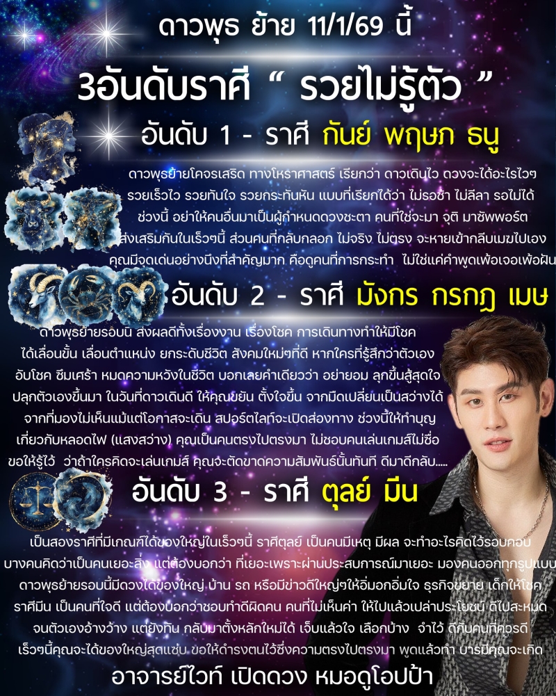 นักพยากรณ์ดังอย่าง หมอไวท์ ดูดวงวันนี้ เผย 3 อันดับราศี รวยไม่รู้ตัว รวยทันใจ รวยกะทันหัน ดาวพุธย้ายรอบนี้ มีข่าวดีใหญ่ๆ ดวงได้ของใหญ่ บ้าน รถ