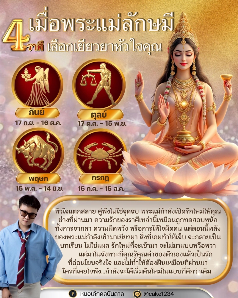 วันที่ 12 ม.ค. 69 ทาง หมอเค้กดลบันดาล เปิด 4 ราศี เมื่อพระแม่ลักษมีเลือกเยียวยาหัวใจคุณ หัวใจของคุณที่เคยแตก กำลังถูกรักษาโดยพลังพระแม่ ได้แก่ กันย์ ตุลย์ พฤษภ กรกฏ