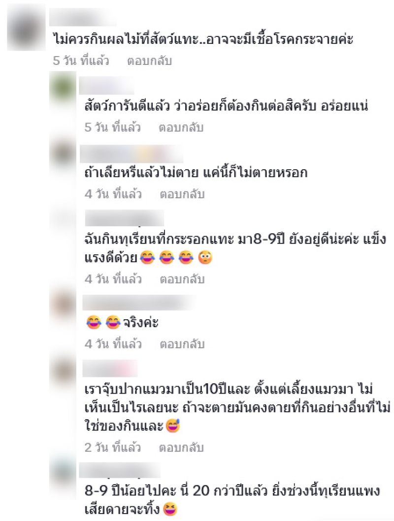 โดยมีชาวเน็ตต่างเข้ามาคอมเมนต์เป็นห่วงว่า ไม่ควรกินผลไม้ที่สัตว์แทะ..อาจจะมีเชื้อโรคกระจายค่ะ,ขอโทษที่ขนลุกค่ะ,ไม่รู้ว่ากินได้ ที่บ้านมีหลายต้นมาก,กินต่อจากสัตว์แล้วอันตรายไม่จริงหรอ