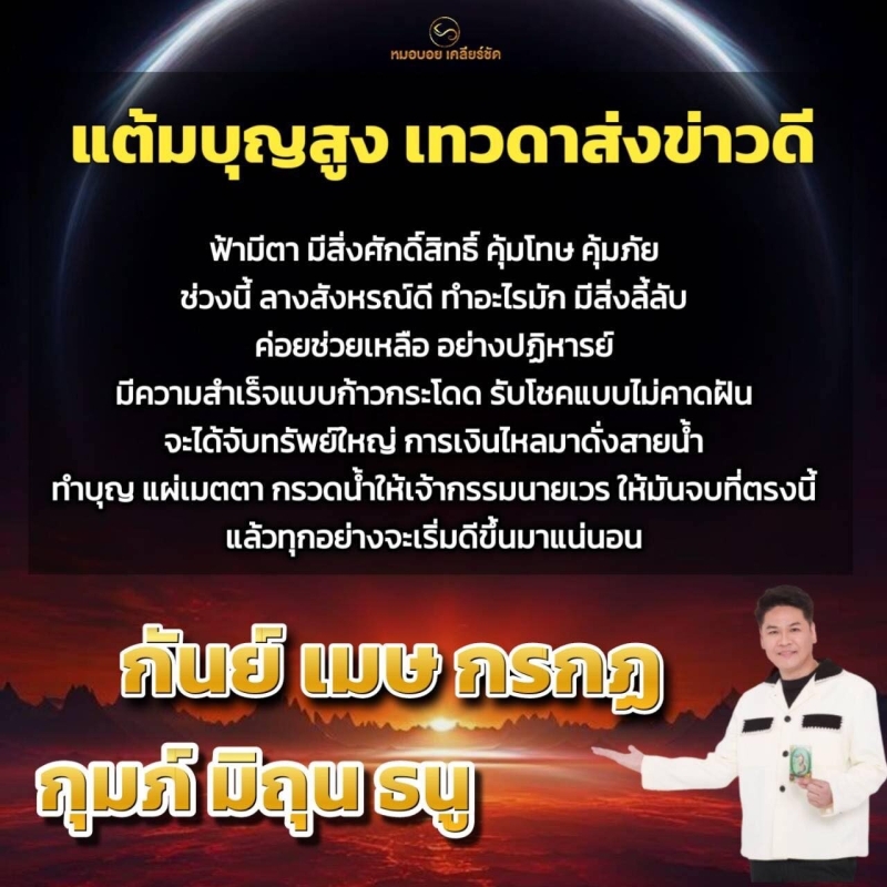 หมอบอย เคลียร์ชัด เผยถึงดวงชะตาราศี แต้มบุญสูง เทวดาส่งข่าวดี ฟ้ามีตา มีสิ่งศักดิ์สิทธิ์ คุ้มโทษ คุ้มภัย ช่วงนี้ลางสังหรณ์ดี ทำอะไรมักมีสิ่งลี้ลับค่อยช่วยเหลืออย่างปฏิหาริย์ มีความสำเร็จแบบก้าวกระโดด รับโชคแบบไม่คาดฝัน จะได้จับทรัพย์ใหญ่ การเงินไหลมาดั่งสายน้ำ ทำบุญ แผ่เมตตา กรวดน้ำให้เจ้ากรรมนายเวรให้มันจบที่ตรงนี้ แล้วทุกอย่างจะเริ่มดีขึ้นมาแน่นอน