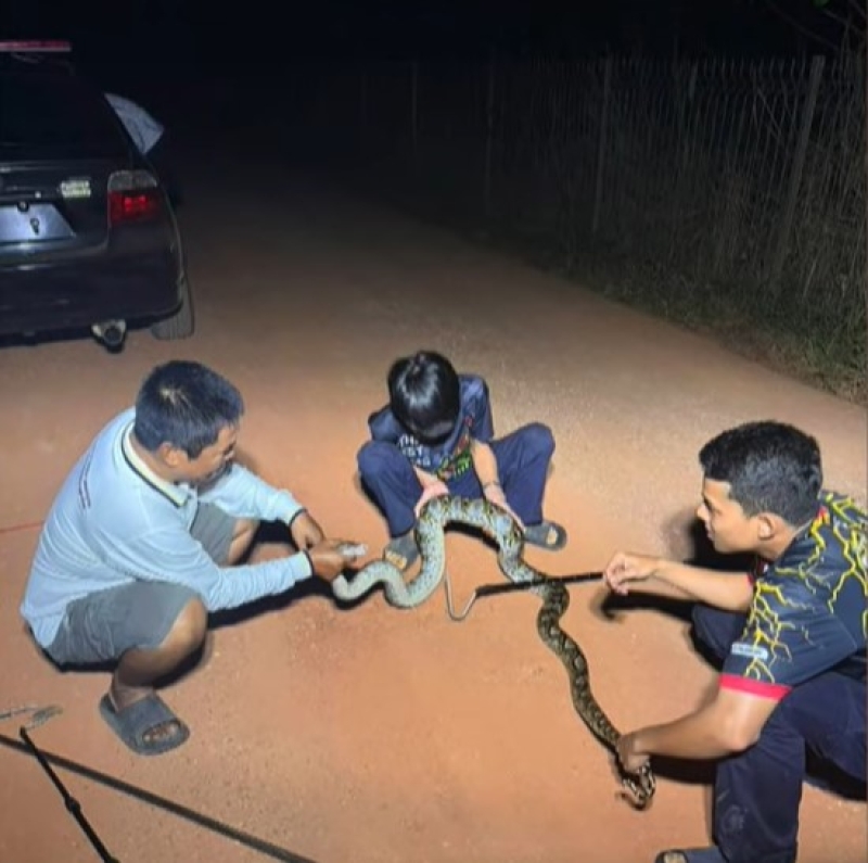 ที่เกิดเหตุอยู่กลางป่ายางพาราพบรถจักรยานยนต์ฮอนด้า เวฟ สีน้ำเงิน หมายเลขทะเบียน 3518 จอดอยู่ โดยพบงูเหลือมขนาดใหญ่ ความยาวประมาณ 4 เมตร เลื้อยขึ้นไปขดตัวและพันอยู่รอบกระจกมองข้างอย่างแน่นหนา นายศราวุธพร้อมทีมกู้ภัยต้องใช้ความระมัดระวังเป็นพิเศษในการเข้าดึงตัวงูออกจากรถ เนื่องจากงูมีพละกำลังมากและพยายามส่งเสียงขู่ฟ่อตลอดเวลา โดยใช้เวลาพักใหญ่ จึงสามารถจับงูยักษ์ตัวนี้ใส่กระสอบได้สำเร็จ เพื่อนำไปปล่อยคืนสู่พื้นที่ป่าธรรมชาติที่ปลอดภัย