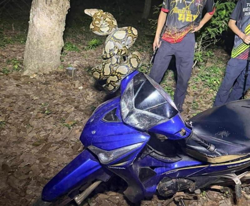 เมื่อวันที่ 25 มกราคม 69 ที่ผ่านมา นายศราวุธ พัดทรัพย์ ผู้ใหญ่บ้านหมู่ 7 บ้านทรัพย์สมบูรณ์ ต.ชุมโค อ.ปะทิว จ.ชุมพร และเป็นหัวหน้าชุดกู้ภัยปะทิว สมาคมนักข่าวจังหวัดชุมพร ได้รับแจ้งขอความช่วยเหลือจากชาวบ้านว่าพบงูเหลือมตัวขนาดใหญ่เลื้อยขึ้นมาอยู่บนรถจักรยานยนต์ภายในสวนยางพาราพื้นที่หมู่ 14 ตำบลชมโค จึงนำกำลังเจ้าหน้าที่พร้อมอุปกรณ์รุดตรวจสอบ