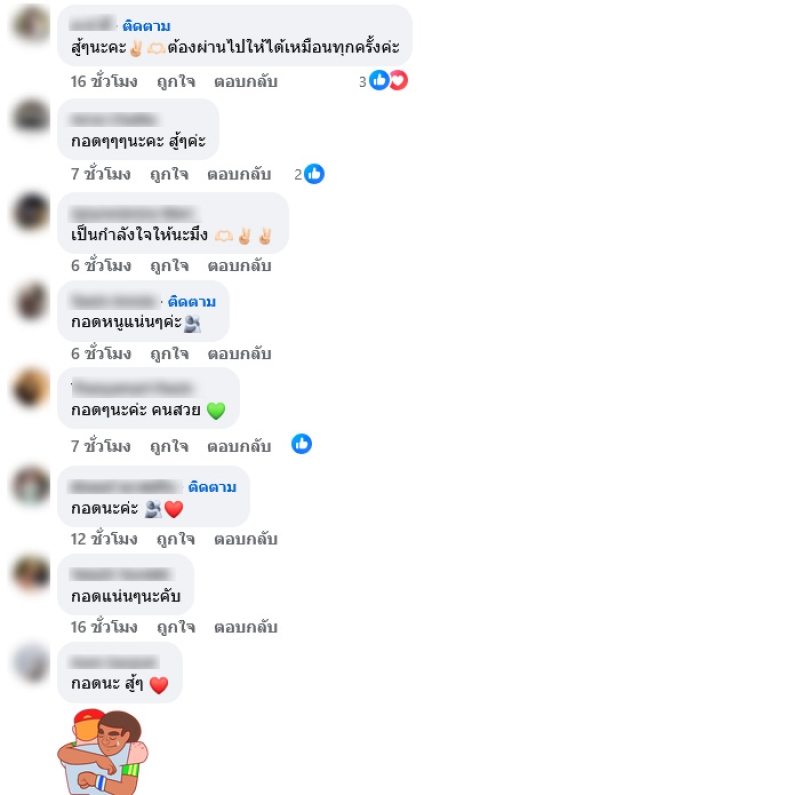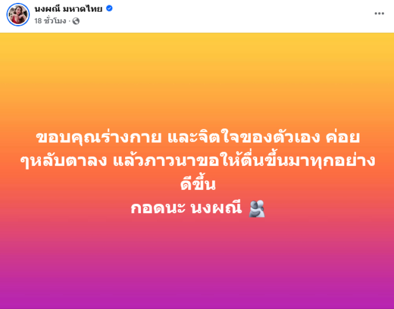 โดยล่าสุด จ๊ะ ได้ออกมาโพสต์ข้อความล่าสุดระบุว่า ขอบคุณร่างกาย และจิตใจของตัวเอง ค่อยๆหลับตาลง แล้วภาวนาขอให้ตื่นขึ้นมาทุกอย่างดีขึ้น กอดนะ นงผณี ท่ามกลางคนบันเทิงและแฟนคลับต่างส่งกำลังใจกันอย่างล้นหลาม