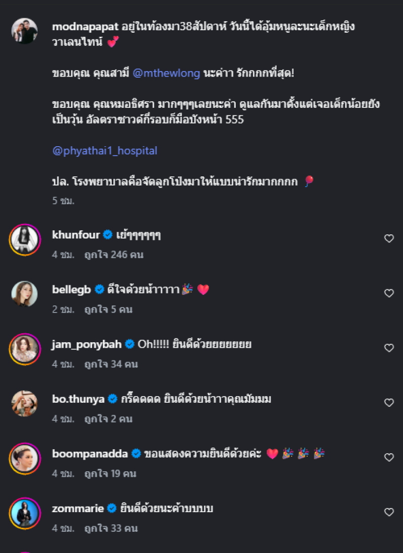 จากที่ก่อนหน้านั้น ทาง มด ณปภัช หรือ มด โฟร์มด ได้คลอดลูกคนแรกเป็นที่เรียบร้อยแล้วสร้างเซอร์ไพรส์และความปลื้มปิติให้กับแฟนคลับทั้ง IG กันเลย โดยเธอได้โพสต์ภาพลงในไอจีเผยโมเมนต์น่ารักๆ ของครอบครัว พร้อมระบุแคปชั่นว่า อยู่ในท้องมา38สัปดาห์ วันนี้ได้อุ้มหนูละนะเด็กหญิงวาเลนไทน์ ขอบคุณ คุณสามี @mthewlong นะค่าา รักกกกที่สุด! ขอบคุณ คุณหมอธิศรา มากๆๆๆเลยนะค่า ดูแลกันมาตั้งแต่เจอเด็กน้อยยังเป็นวุ้น อัลตราซาวด์กี่รอบก็มือบังหน้า 555 @phyathai1_hospital ปล. โรงพยาบาลคือจัดลูกโป่งมาให้แบบน่ารักมากกกก