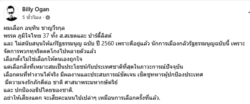 เรียกได้ว่าเป็นอีกหนึ่งนักร้องรุ่นใหญ่ที่ออกมาแสดงจุดยืนด้านการเงินสำหรับ บิลลี่ โอแกน ที่ล่าสุดได้ออกมาโพสต์ข้อความระบุว่า ผมเลือก อนุทิน ชาญวีรกุล พรรค ภูมิใจไทย 37 ทั้ง ส.สเขตและ ปาร์ตี้ลิสต์ และ ไม่สนับสนุนให้แก้รัฐธรรมนูญ ฉบับ ปี 2560 เพราะดีอยู่แล้ว