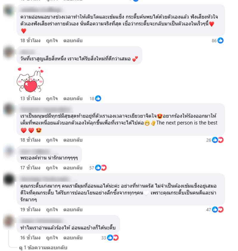 ในบางคราว สิ่งที่ช่วยประคับประคองหัวใจ มิใช่ถ้อยคำปลอบโยน หากคือการได้มีที่นั่งอย่างสงบ และการได้รับพระเมตตา ที่ตรัสกับหัวใจของหม่อมฉันโดยนัยว่า “มิจำเป็นต้องเข้มแข็งอยู่เสมอไป” ขอประทานกราบขอบพระคุณจากดวงใจ ด้วยความสำนึกในพระกรุณาธิคุณอย่างหาที่สุดมิได้
