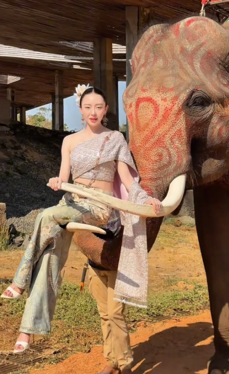 โดยห่มสไบใส่ยีนส์ ไปท่องเที่ยวที่จังหวัดสุรินทร์ พร้อมเขียนเเคปชั่นว่า หมวยมาช้า..แต่มีเพื่อนมาด้วยนะคะ ทั้งนี้กลับมีชาวเน็ตรายหนึ่งเข้ามาคอมเมนต์เชิงดราม่าว่า หวังว่าคนจะไม่ไปขึ้นงาช้างตามนะ น้องคงหนักแน่ๆ ถึงจะบอกแค่แป๊บเดียวก็เถอะ