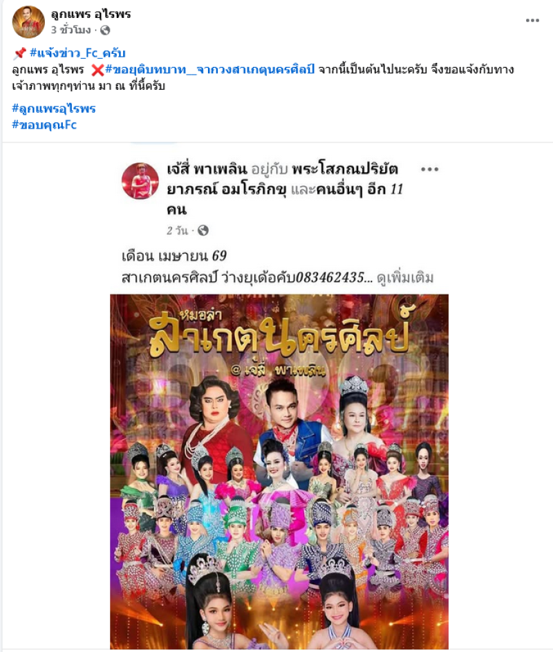 เรียกได้ว่า เป็นหมอลำที่อยู่มาทุกยุค สำหรับ ลูกแพร อุไรพร ที่ล่าสุด ได้ออกมาโพสต์ยุติบยทมบาทแล้ว โดยได้เผยว่า แจ้งข่าว_Fc_ครับ ลูกแพร อุไรพร ขอยุติบทบาท__จากวงสาเกตุนครศิลป์ จากนี้เป็นต้นไปนะครับ จึงขอแจ้งกับทางเจ้าภาพทุกๆท่าน มา ณ ที่นี้ครับ”