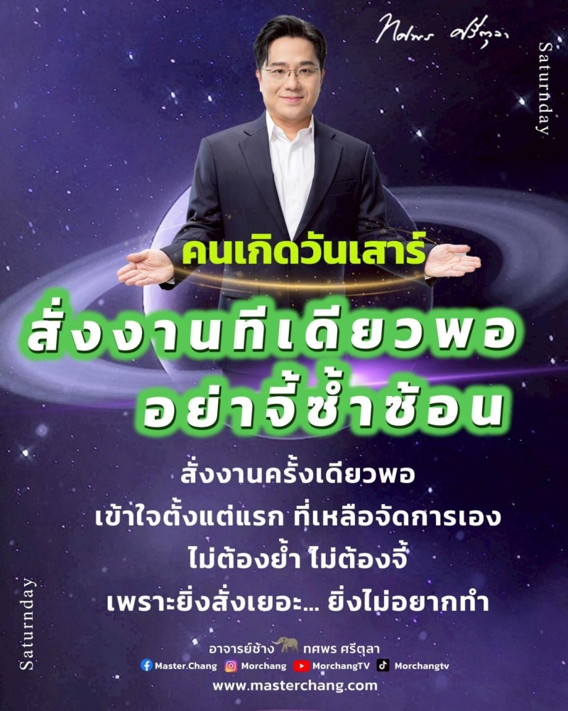 เรียกได้ว่า หลายคนคงรู้จักกันเป็นอย่างดี กับ อาจารย์ช้าง ทศพร ศรีตุลา ได้ออกมาทำนายเกี่ยวกับนิสัย และวิธีทำงานของผู้ที่เกิดวันเสาร์ ถือเป็นอีกหนึ่งวันเกิดที่มีคาแรกเตอร์ชัดเจน และไม่เหมือนใคร