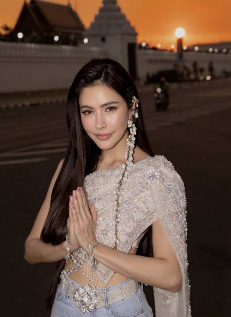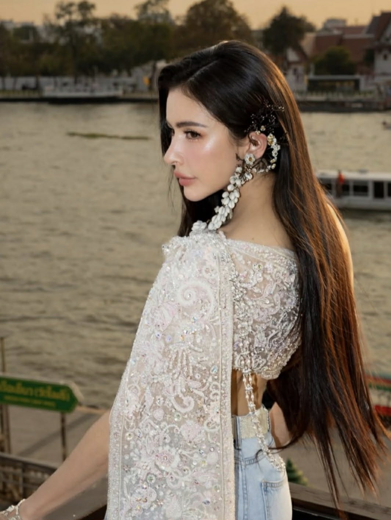 โดย เธอ เลือกผ้าสไบโทนอ่อน ดีเทลงานปักละเอียด ประกบกับยีนส์ทรงเรียบเนี้ยบ เสริมแอ็กเซสซอรีแบบพอดีไม่มากไม่น้อย ทำให้ภาพรวมดูหรูแบบไม่พยายาม