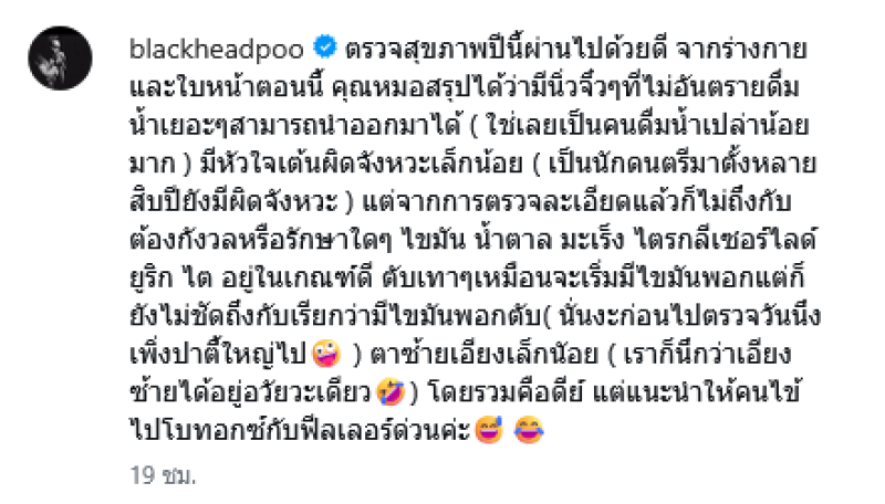 เรียกได้ว่าเป็นอีกหนึ่งศิลปินรุ่นใหญ่สำหรับ ปู แบล็คเฮด ที่ล่าสุดได้เผยผลตรวจสุขภาพร่างกายประจำปีนี้ให้แฟนๆได้ทราบ โดยระบุว่า ตรวจสุขภาพปีนี้ผ่านไปด้วยดี จากร่างกายและใบหน้าตอนนี้ คุณหมอสรุปได้ว่ามีนิ่วจิ๋วๆที่ไม่อันตรายดื่มน้ำเยอะๆสามารถนำออกมาได้