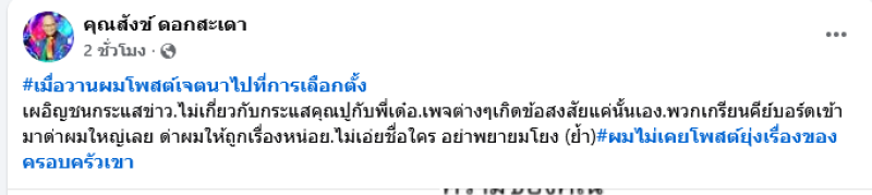 หลังจากนั้น สังข์ ดอกสะเดา ก็เปลี่ยนแคปชั่นในเฟซบุ๊กว่า มึงอย่าตอแหxให้มากนัก กูจะเลือกใคร สิทธิ์ของกู ก่อนจะโพสต์ภาพแคปข่าวตัวเองและเขียนข้อความว่า เมื่อวานผมโพสต์เจตนาไปที่การเลือกตั้ง เผอิญชนกระแสข่าว.ไม่เกี่ยวกับกระแสคุณปูกับพี่เด๋อ.เพจต่างๆ เกิดข้อสงสัยแค่นั้นเอง.พวกเกรียนคีย์บอร์ดเข้ามาด่าผมใหญ่เลย ด่าผมให้ถูกเรื่องหน่อย.ไม่เอ่ยชื่อใคร อย่าพยายามโยง (ย้ำ) ผมไม่เคยโพสต์ยุ่งเรื่องของครอบครัวเขา