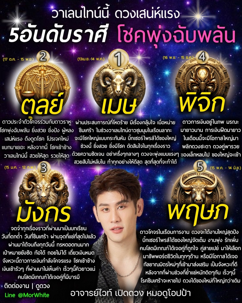 ล่าสุดนักพยากรณ์ดังอย่าง หมอไวท์ ทำนายดวงชะตา 5 อันดับราศี โชคพุ่งฉับพลัน วาเลนไทน์นี้ ดวงเสน่ห์แรง จังหวะนี้ดาวการเงินกำลังโคจรแรง โชคเข้าข้าง เงินเข้ารัวๆ