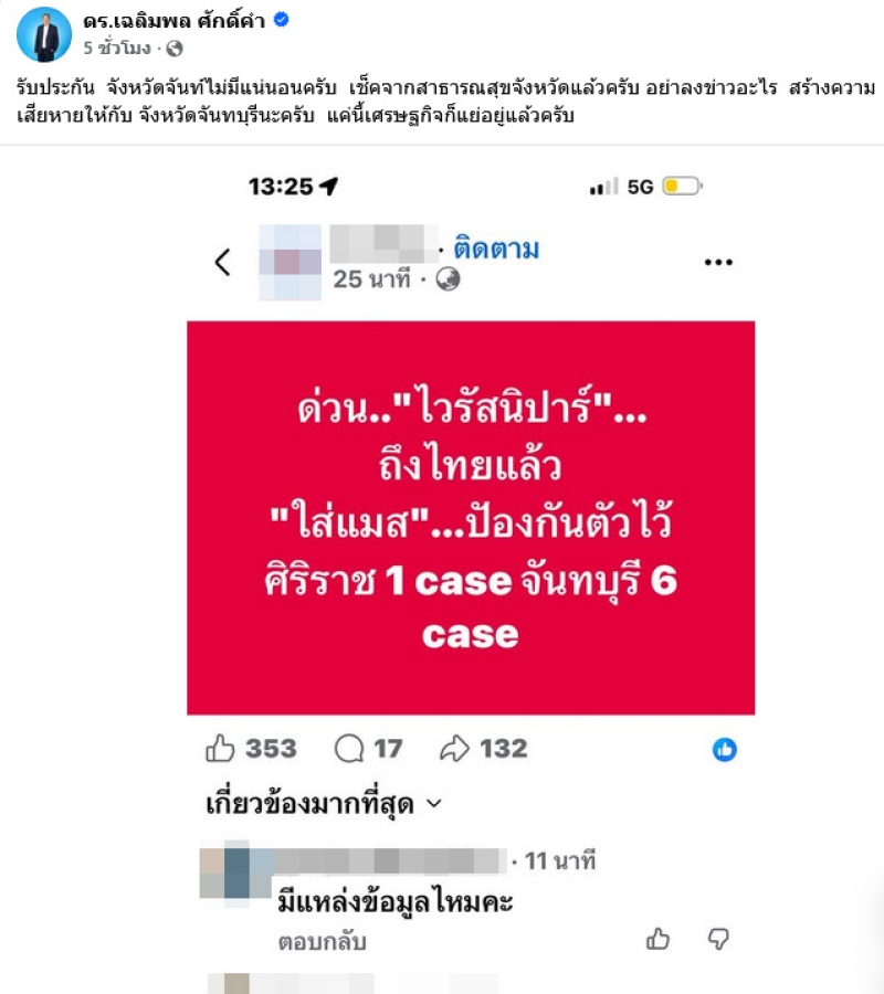 จากกรณีที่มีเพจข่าวรายหนึ่งออกมาโพสต์สร้างความตื่นตระหนกระบุว่า ด่วน ไวรัสนิปาร์ ถึงไทยแล้ว ใส่แมสก์ป้องกันตัวไว้ ศิริราช 1 case จันทบุรี 6 case ทำให้โวเชียลเเละคนที่อยู่ในพื้นที่ต่างตกใจเเละหวาดกลัว